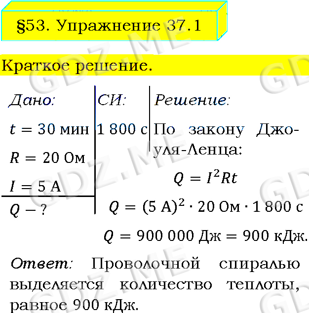 Подробный вариант решения из решебника (ГДЗ): Упражнение номер 1 (§53. Нагревание проводников электрическим током. Закон Джоуля—Ленца. Упражнение 37) по предмету Физика, за 8 класс, авторы учебника Пёрышкин А.В..