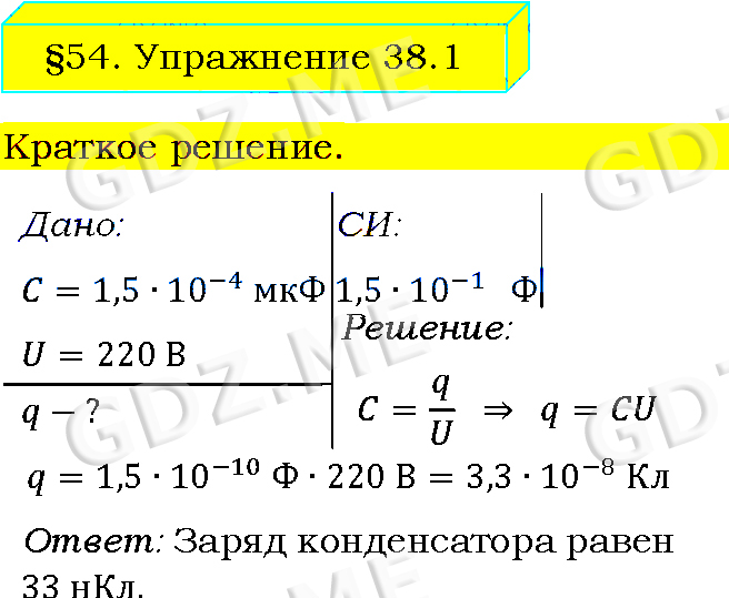 Подробный вариант решения из решебника (ГДЗ): Упражнение номер 1 (§54. Конденсатор. Упражнение 38) по предмету Физика, за 8 класс, авторы учебника Пёрышкин А.В..
