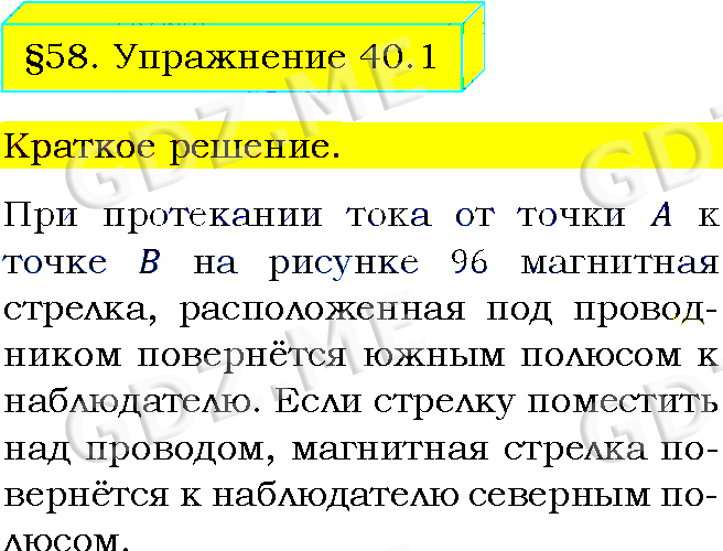 Подробный вариант решения из решебника (ГДЗ): Упражнение номер 1 (§58. Магнитное поле прямого тока. Магнитные линии. Упражнение 40) по предмету Физика, за 8 класс, авторы учебника Пёрышкин А.В..