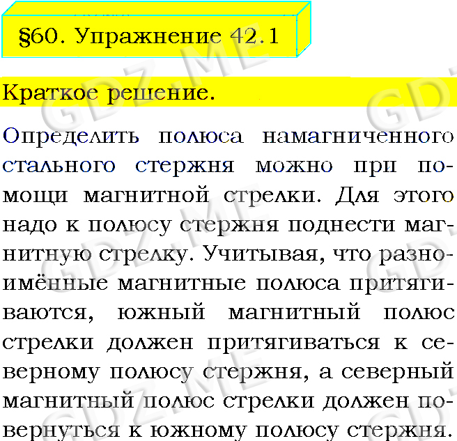 Подробный вариант решения из решебника (ГДЗ): Упражнение номер 1 (§60. Постоянные магниты. Магнитное поле постоянных магнитов. Упражнение 42) по предмету Физика, за 8 класс, авторы учебника Пёрышкин А.В..