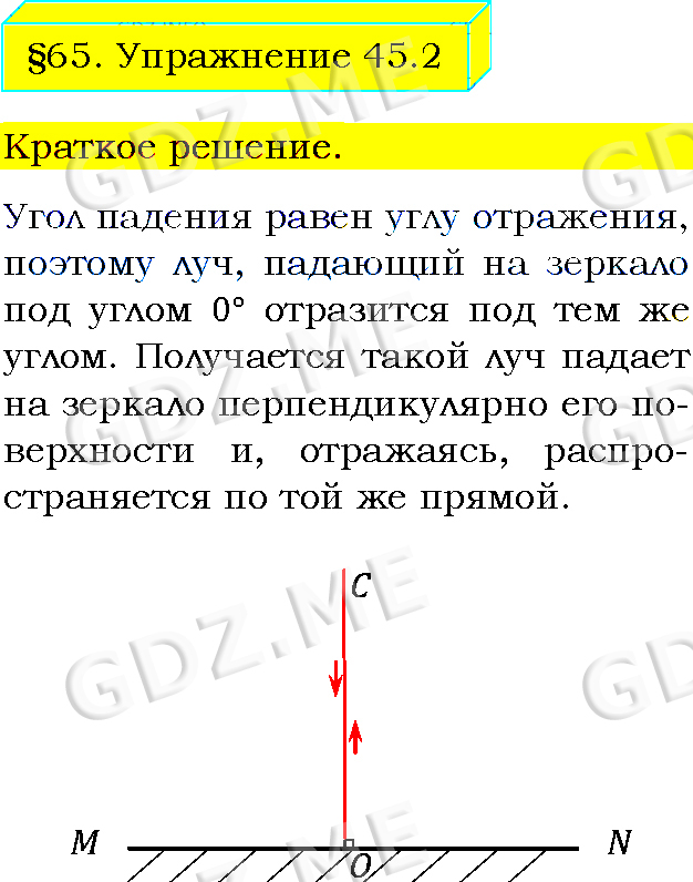 Подробный вариант решения из решебника (ГДЗ): Упражнение номер 2 (§65. Отражение света. Закон отражения света. Упражнение 45) по предмету Физика, за 8 класс, авторы учебника Пёрышкин А.В..