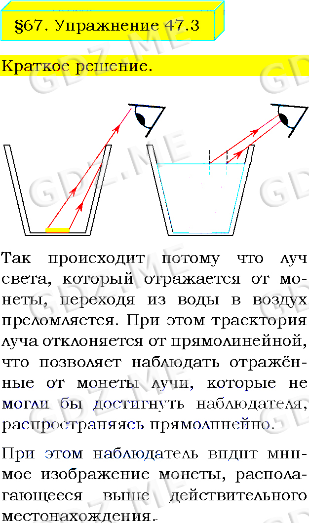 Подробный вариант решения из решебника (ГДЗ): Упражнение номер 3 (§67. Преломление света. Закон преломления света. Упражнение 47) по предмету Физика, за 8 класс, авторы учебника Пёрышкин А.В..
