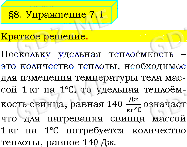 Подробный вариант решения из решебника (ГДЗ): Упражнение номер 1 (§8. Удельная теплоёмкость. Упражнение 7) по предмету Физика, за 8 класс, авторы учебника Пёрышкин А.В..