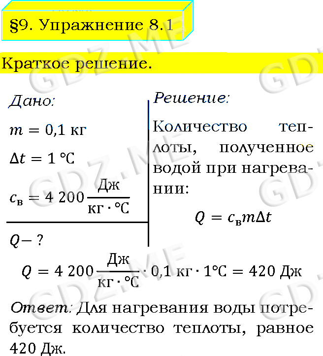 Подробный вариант решения из решебника (ГДЗ): Упражнение номер 1 (§9. Расчёт количества теплоты, необходимого для нагревания тела или выделяемого им при охлаждении. Упражнение 8) по предмету Физика, за 8 класс, авторы учебника Пёрышкин А.В..