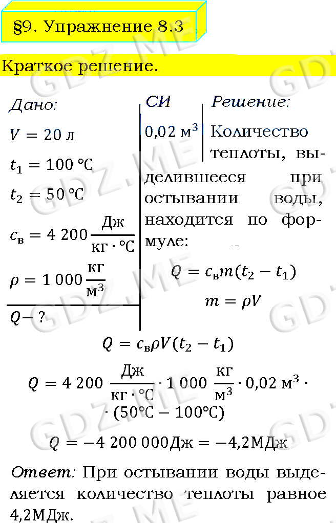 Подробный вариант решения из решебника (ГДЗ): Упражнение номер 3 (§9. Расчёт количества теплоты, необходимого для нагревания тела или выделяемого им при охлаждении. Упражнение 8) по предмету Физика, за 8 класс, авторы учебника Пёрышкин А.В..