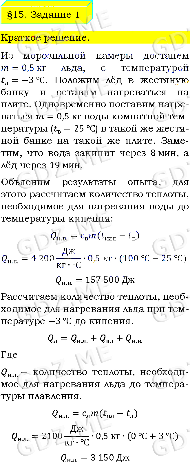 Подробный вариант решения из решебника (ГДЗ): Задание номер 1 (§15. Удельная теплота плавления. Задание) по предмету Физика, за 8 класс, авторы учебника Пёрышкин А.В..