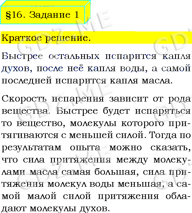 Подробный вариант решения из решебника (ГДЗ): Задание номер 1 (§16. Испарение. Насыщенный и ненасыщенный пар. Задание) по предмету Физика, за 8 класс, авторы учебника Пёрышкин А.В..