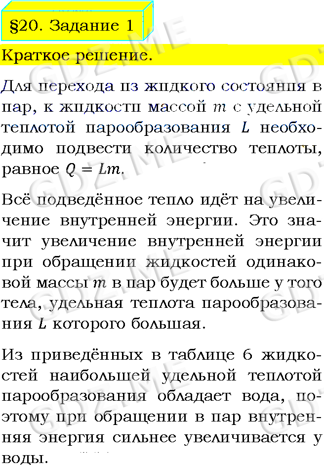 Подробный вариант решения из решебника (ГДЗ): Задание номер 1 (§20. Удельная теплота парообразования и конденсации. Задание) по предмету Физика, за 8 класс, авторы учебника Пёрышкин А.В..