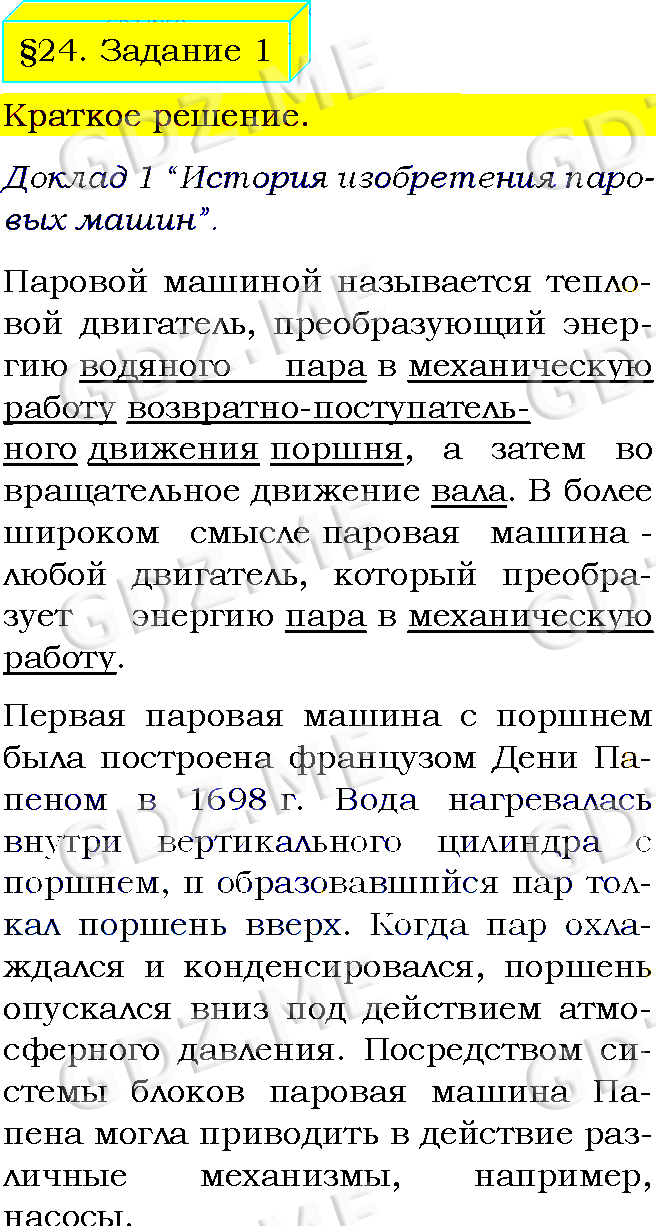 Подробный вариант решения из решебника (ГДЗ): Задание номер 1 (§24. КПД теплового двигателя. Задание) по предмету Физика, за 8 класс, авторы учебника Пёрышкин А.В..