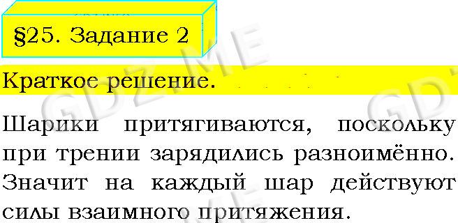 Подробный вариант решения из решебника (ГДЗ): Задание номер 2 (§25. Электризация тел при соприкосновении. Взаимодействие заряженных тел. Задание) по предмету Физика, за 8 класс, авторы учебника Пёрышкин А.В..