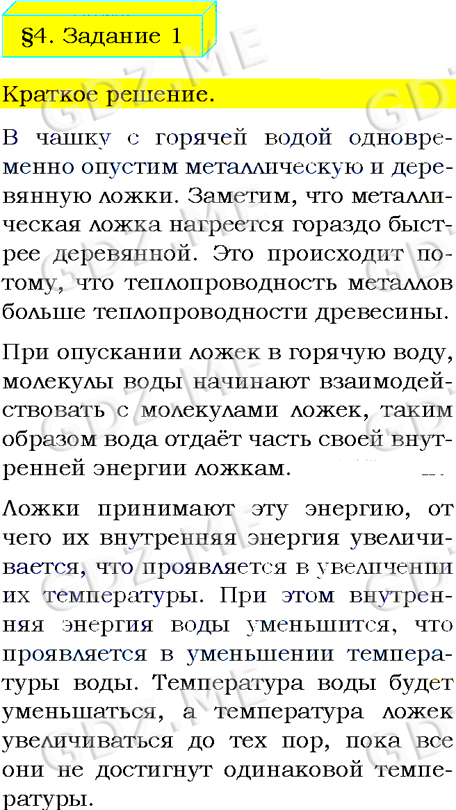 Подробный вариант решения из решебника (ГДЗ): Задание номер 1 (§4. Теплопроводность. Задание) по предмету Физика, за 8 класс, авторы учебника Пёрышкин А.В..