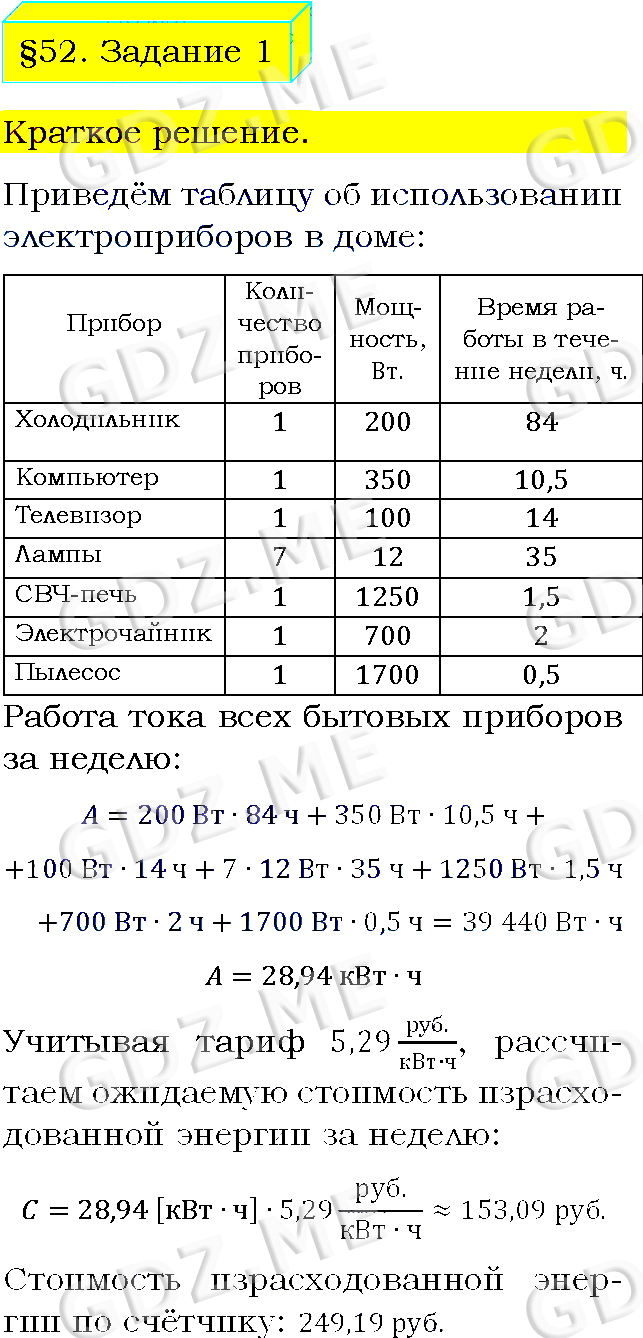 Подробный вариант решения из решебника (ГДЗ): Задание номер 1 (§52. Единицы работы электрического тока, применяемые на практике. Задание) по предмету Физика, за 8 класс, авторы учебника Пёрышкин А.В..