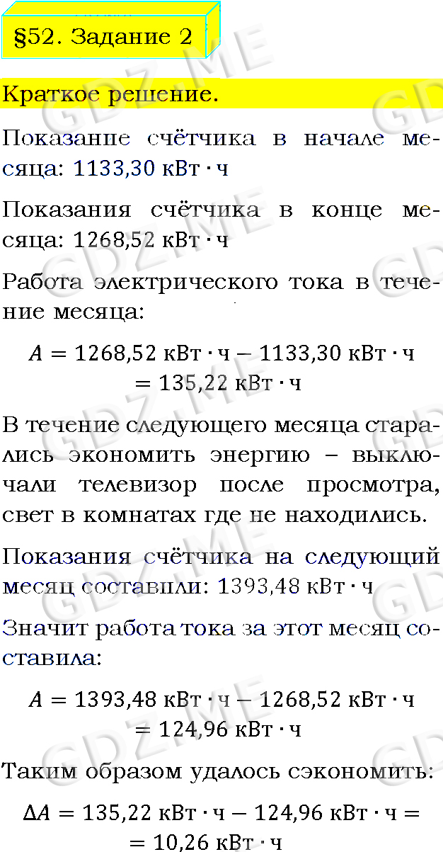 Подробный вариант решения из решебника (ГДЗ): Задание номер 2 (§52. Единицы работы электрического тока, применяемые на практике. Задание) по предмету Физика, за 8 класс, авторы учебника Пёрышкин А.В..