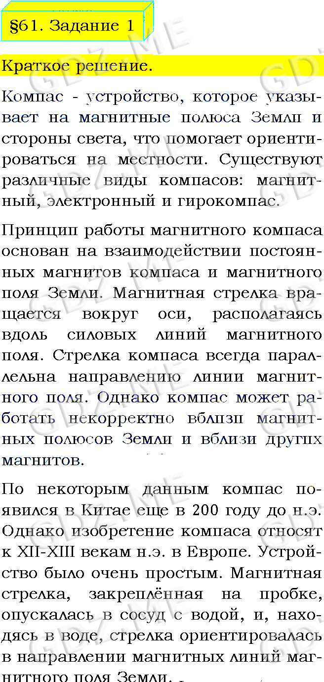Подробный вариант решения из решебника (ГДЗ): Задание номер 1 (§61. Магнитное поле Земли. Задание) по предмету Физика, за 8 класс, авторы учебника Пёрышкин А.В..