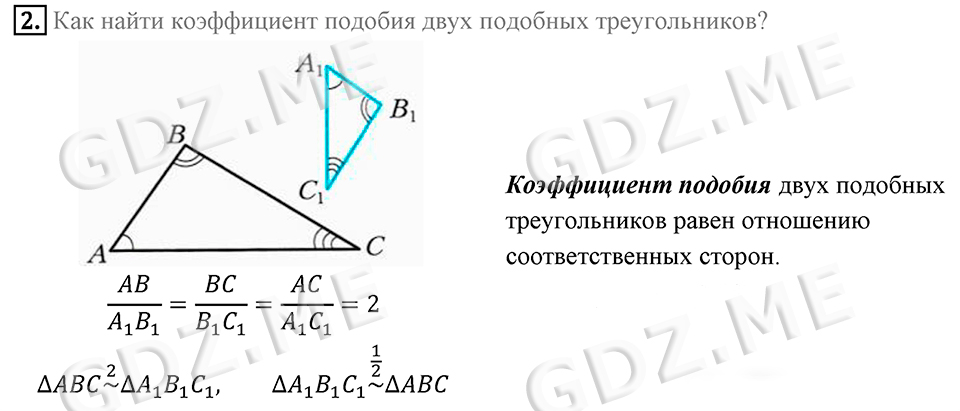 Подробный вариант решения из решебника (ГДЗ): Номер номер 2 (2 глава. Номера с 367 по 509 (Подобие треугольников. Страницы 74 - 110.). Вопросы к §12. Cтраница 86) по предмету Геометрия, за 8 класс, авторы учебника Мерзляк, Полонский, Якир.