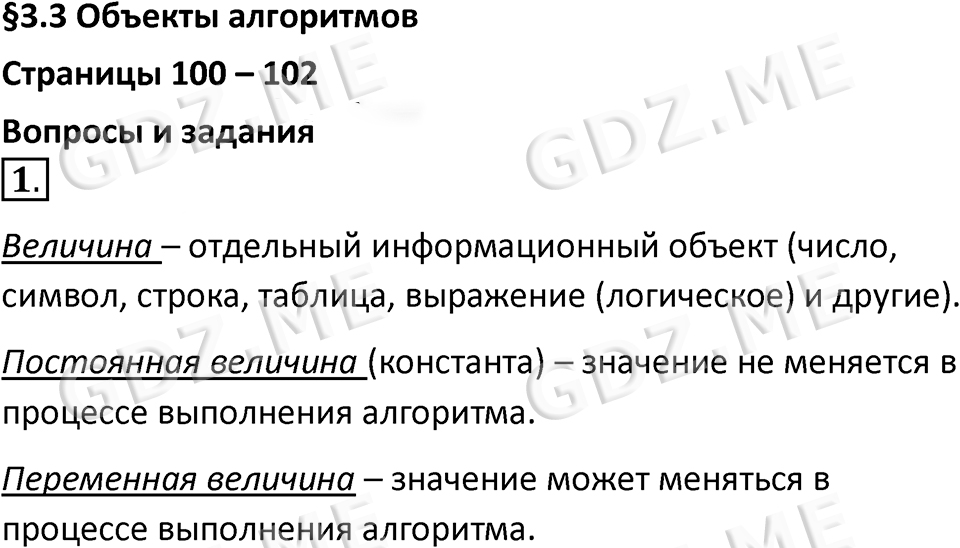 Подробный вариант решения из решебника (ГДЗ): Номер номер 1 (НОМЕРА РЕШЕНИЙ. §3.3. Объекты алгоритмов. Страницы 100-102. Вопросы и задания) по предмету 8 класс, за , авторы учебника Босова.