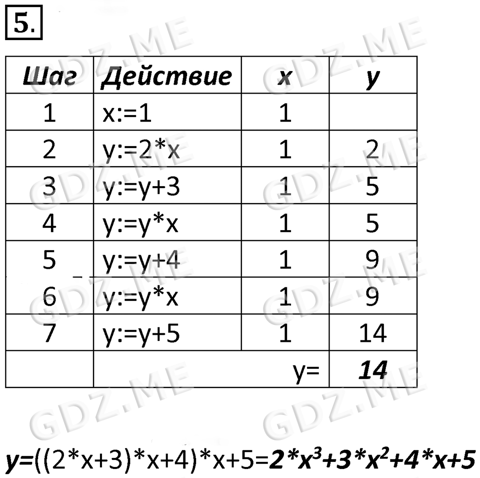 Подробный вариант решения из решебника (ГДЗ): Номер номер 5 (НОМЕРА РЕШЕНИЙ. §3.4. Алгоритмическая конструкция «следование». Линейные алгоритмы. Страницы 109-110. Вопросы и задания) по предмету 8 класс, за , авторы учебника Босова.
