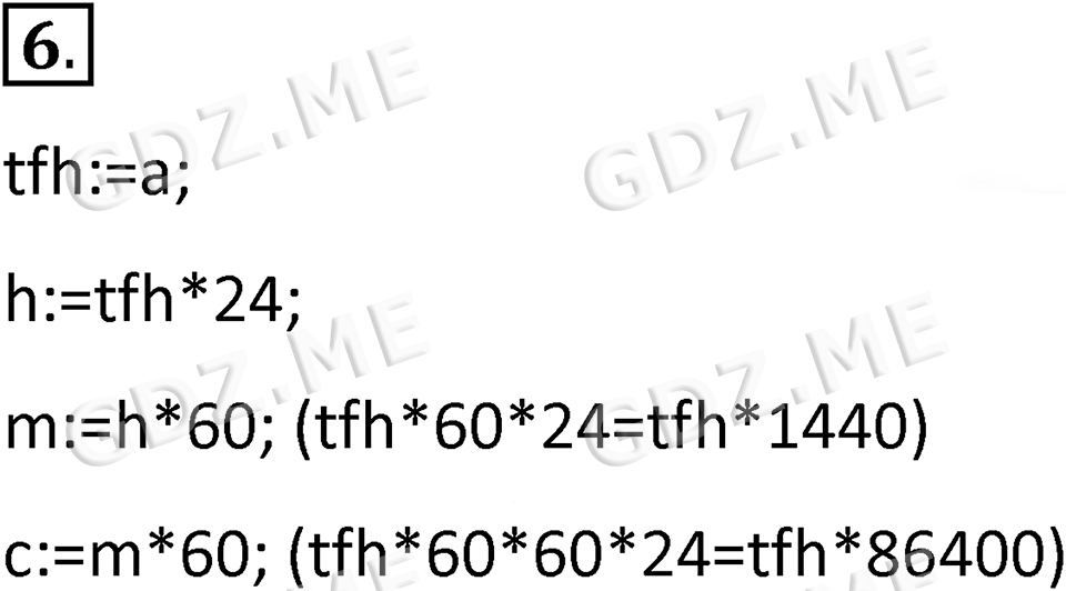 Подробный вариант решения из решебника (ГДЗ): Номер номер 6 (НОМЕРА РЕШЕНИЙ. §3.4. Алгоритмическая конструкция «следование». Линейные алгоритмы. Страницы 109-110. Вопросы и задания) по предмету 8 класс, за , авторы учебника Босова.
