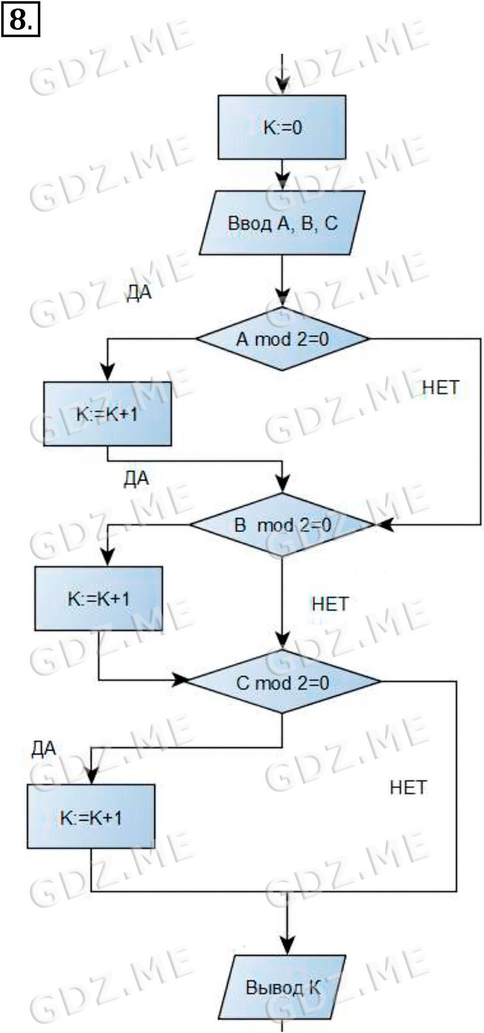 Подробный вариант решения из решебника (ГДЗ): Номер номер 8 (НОМЕРА РЕШЕНИЙ. §3.5. Алгоритмическая конструкция «ветвление». Разветвляющиеся алгоритмы. Страницы 115-118. Вопросы и задания) по предмету 8 класс, за , авторы учебника Босова.