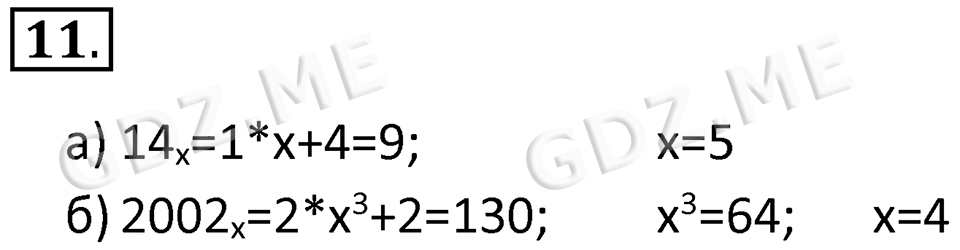 Подробный вариант решения из решебника (ГДЗ): Номер номер 11 (НОМЕРА РЕШЕНИЙ. §1.1. Общие сведения о системах счисления. Страницы 13-14. Вопросы и задания) по предмету 8 класс, за , авторы учебника Босова.