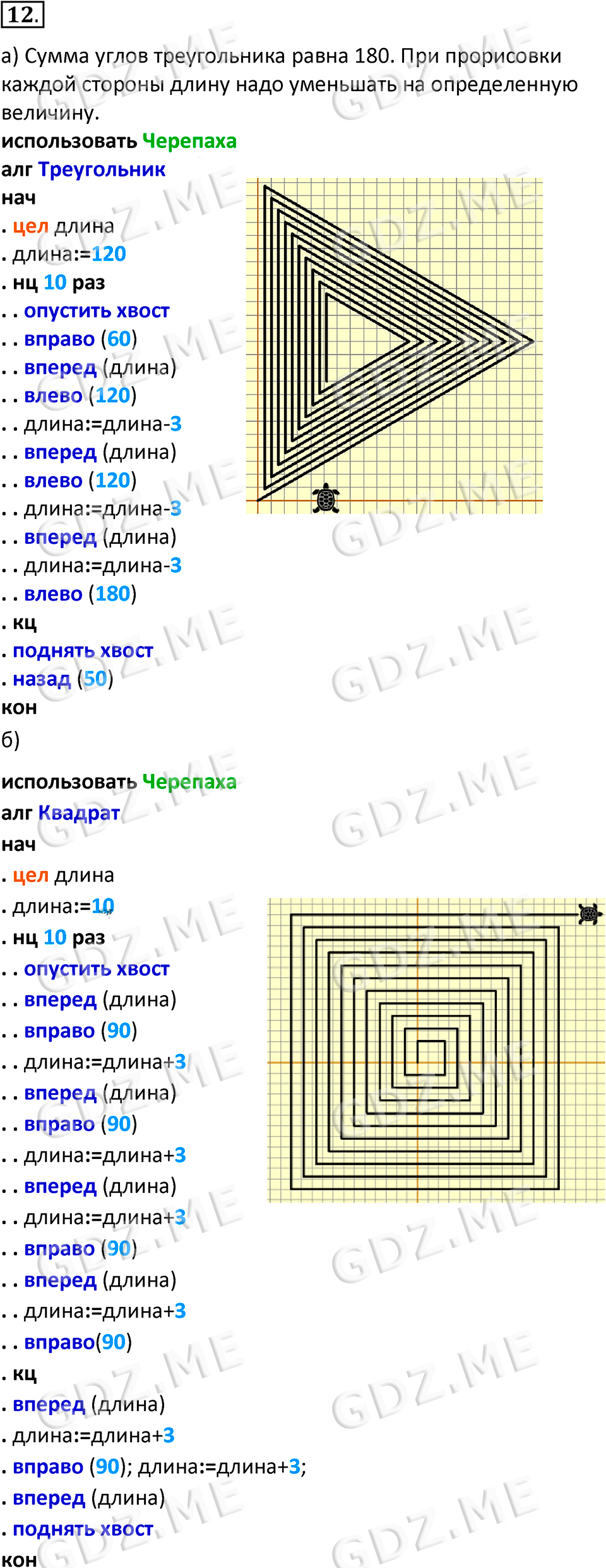 Подробный вариант решения из решебника (ГДЗ): Номер номер 12 (НОМЕРА РЕШЕНИЙ. §3.6. Алгоритмическая конструкция «повторение». Циклические алгоритмы. Страницы 133-136. Вопросы и задания) по предмету 8 класс, за , авторы учебника Босова.
