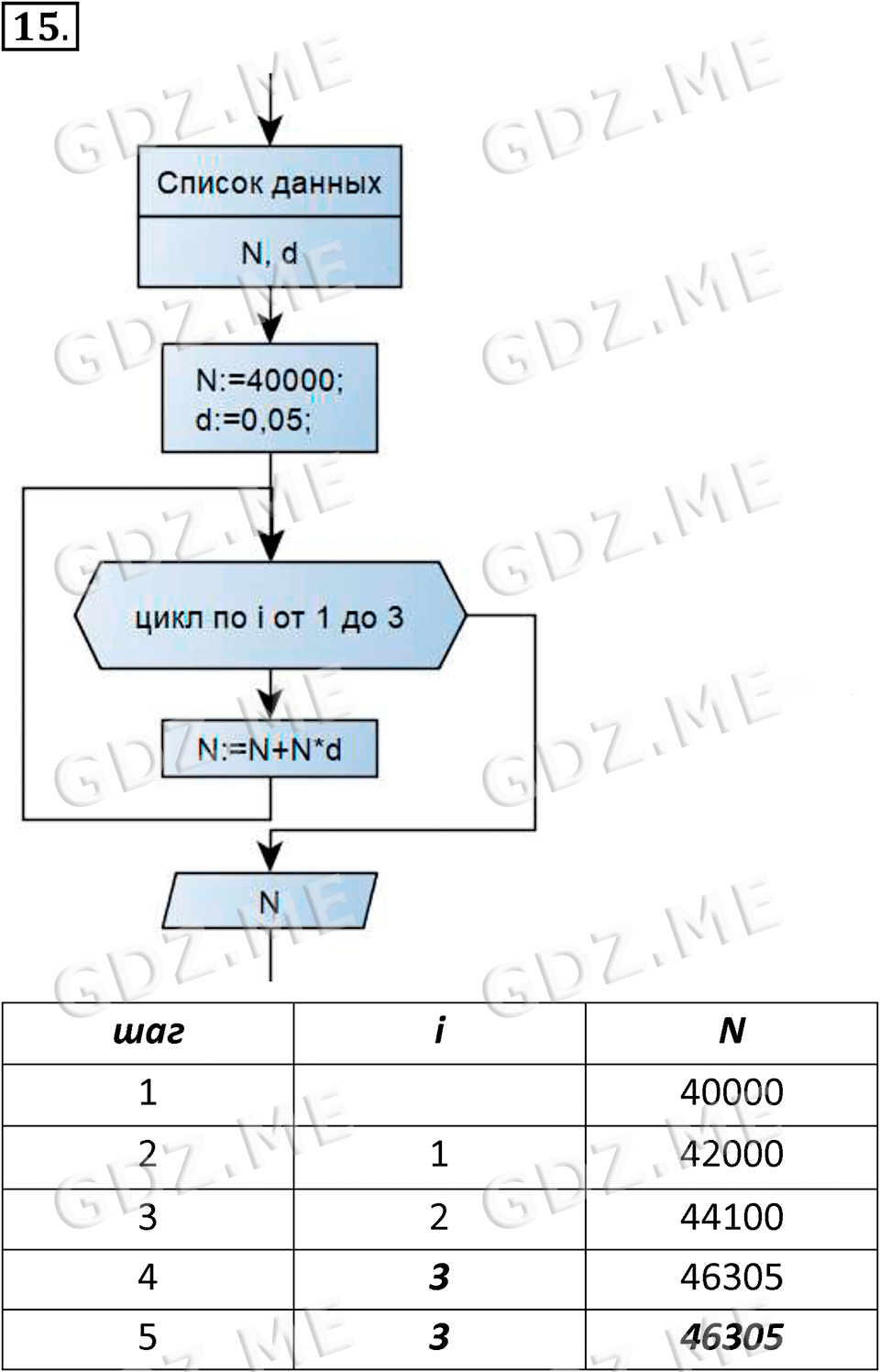 Подробный вариант решения из решебника (ГДЗ): Номер номер 15 (НОМЕРА РЕШЕНИЙ. §3.6. Алгоритмическая конструкция «повторение». Циклические алгоритмы. Страницы 133-136. Вопросы и задания) по предмету 8 класс, за , авторы учебника Босова.