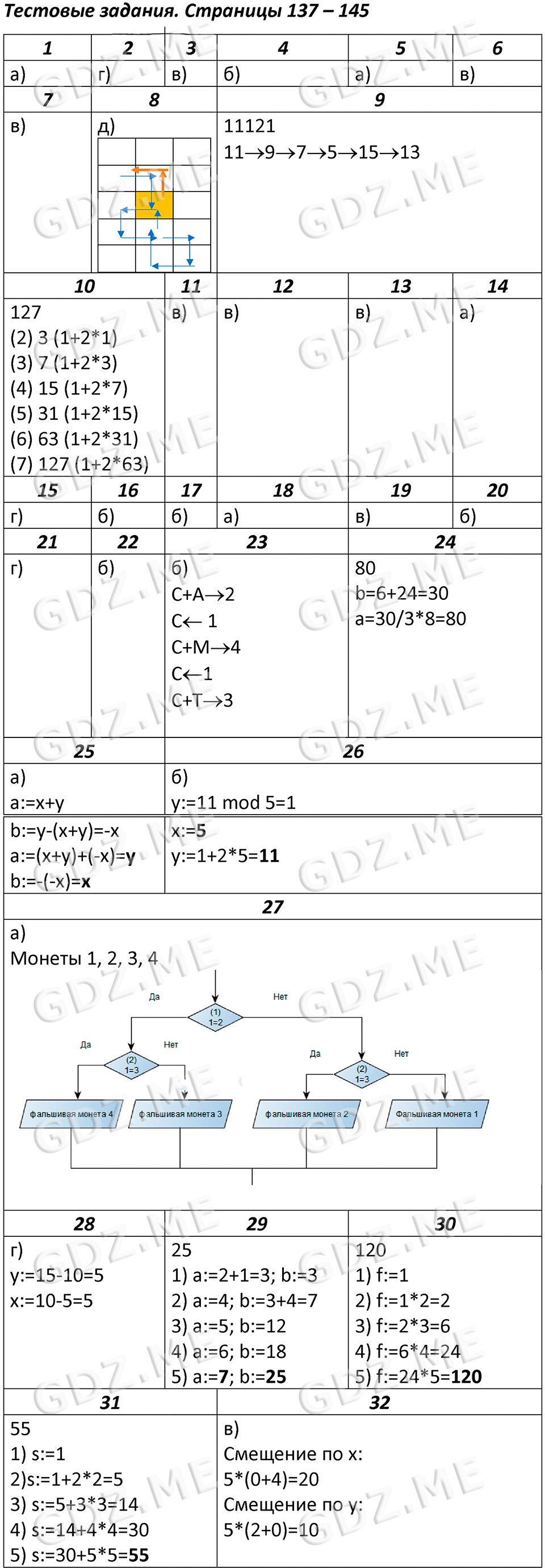 Подробный вариант решения из решебника (ГДЗ): Номер номер 137-145.test.1 (НОМЕРА РЕШЕНИЙ. §3.6. Алгоритмическая конструкция «повторение». Циклические алгоритмы. Страницы 133-136. Вопросы и задания) по предмету 8 класс, за , авторы учебника Босова.