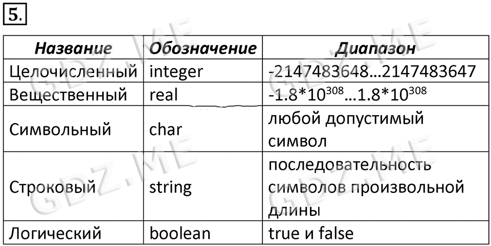 Подробный вариант решения из решебника (ГДЗ): Номер номер 5 (НОМЕРА РЕШЕНИЙ. §4.1. Общие сведения о языке программирования Паскаль. Страницы 153-154. Вопросы и задания) по предмету 8 класс, за , авторы учебника Босова.