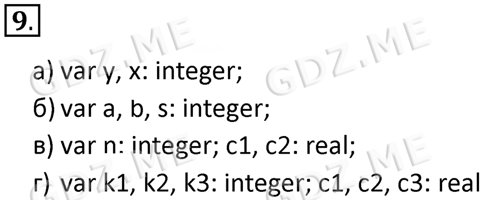 Подробный вариант решения из решебника (ГДЗ): Номер номер 9 (НОМЕРА РЕШЕНИЙ. §4.1. Общие сведения о языке программирования Паскаль. Страницы 153-154. Вопросы и задания) по предмету 8 класс, за , авторы учебника Босова.