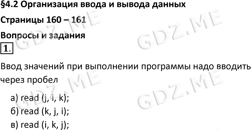 Подробный вариант решения из решебника (ГДЗ): Номер номер 1 (НОМЕРА РЕШЕНИЙ. §4.2. Организация ввода и вывода данных. Страницы 160-161. Вопросы и задания) по предмету 8 класс, за , авторы учебника Босова.
