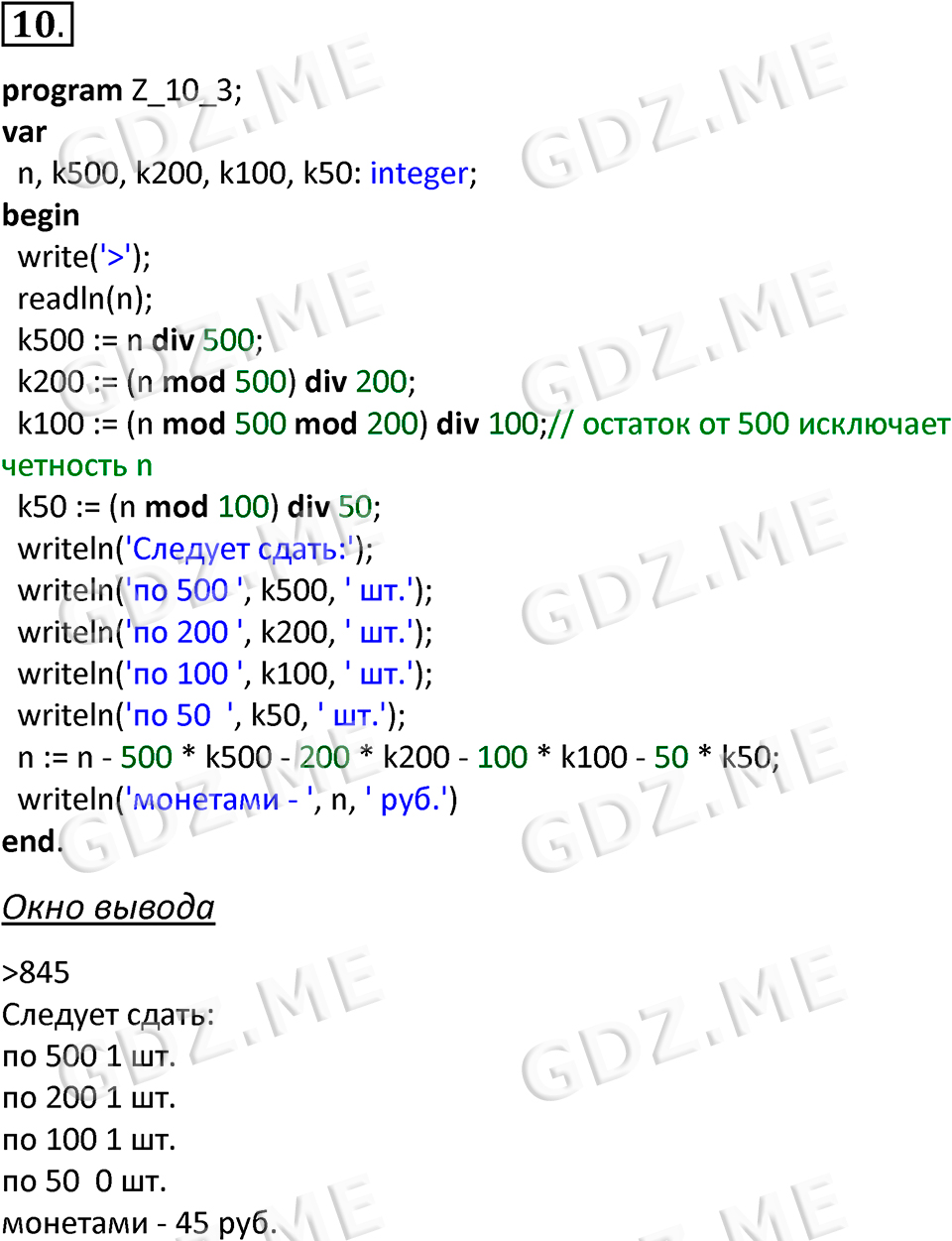 Подробный вариант решения из решебника (ГДЗ): Номер номер 10 (НОМЕРА РЕШЕНИЙ. §4.3. Программирование линейных алгоритмов. Страницы 168-173. Вопросы и задания) по предмету 8 класс, за , авторы учебника Босова.