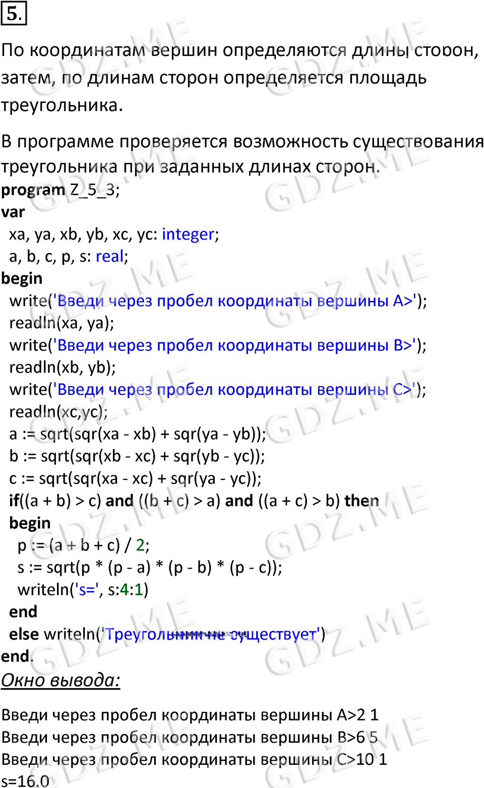 Подробный вариант решения из решебника (ГДЗ): Номер номер 5 (НОМЕРА РЕШЕНИЙ. §4.3. Программирование линейных алгоритмов. Страницы 168-173. Вопросы и задания) по предмету 8 класс, за , авторы учебника Босова.