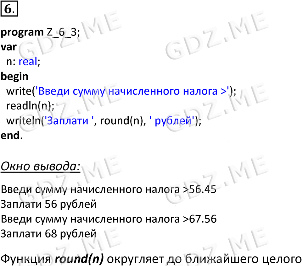 Подробный вариант решения из решебника (ГДЗ): Номер номер 6 (НОМЕРА РЕШЕНИЙ. §4.3. Программирование линейных алгоритмов. Страницы 168-173. Вопросы и задания) по предмету 8 класс, за , авторы учебника Босова.