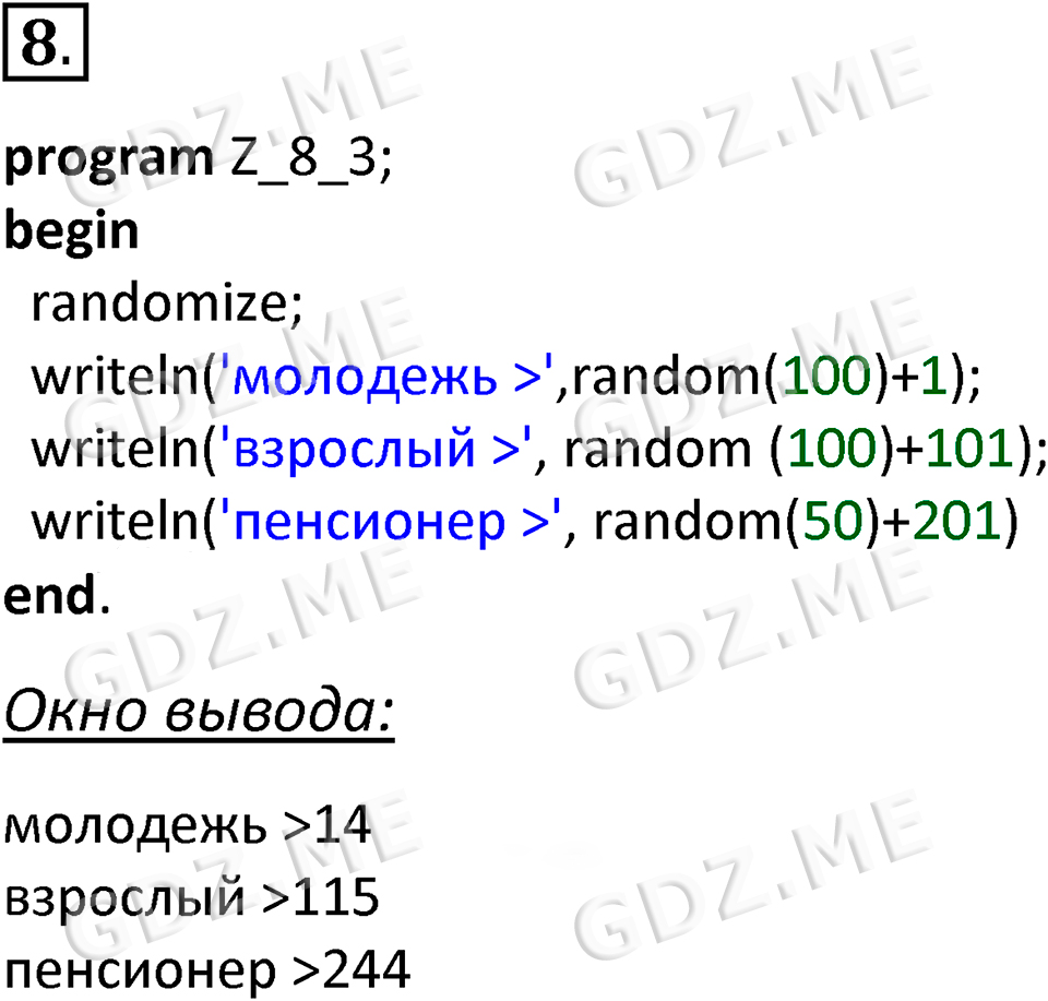 Подробный вариант решения из решебника (ГДЗ): Номер номер 8 (НОМЕРА РЕШЕНИЙ. §4.3. Программирование линейных алгоритмов. Страницы 168-173. Вопросы и задания) по предмету 8 класс, за , авторы учебника Босова.