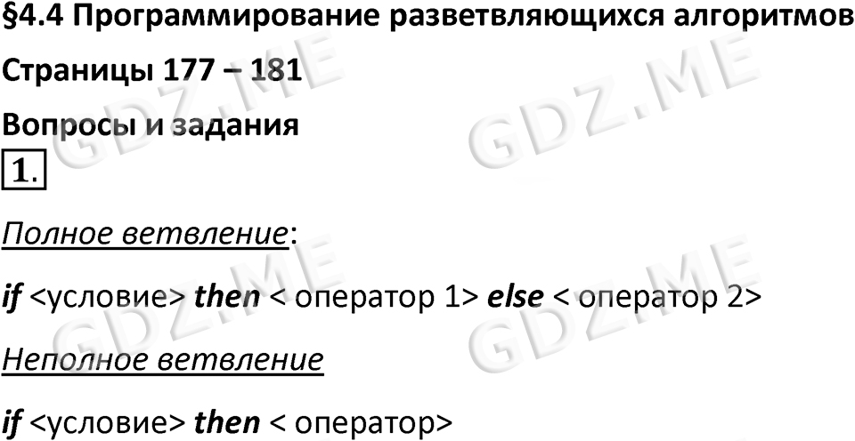 1 2.1 2.2 3 4 5 6 7 8 9 10 11 12 13 14 15 16 17 18§4.4. Программирование разветвляющихся алгоритмов. Страницы 177-181. Вопросы и задания: