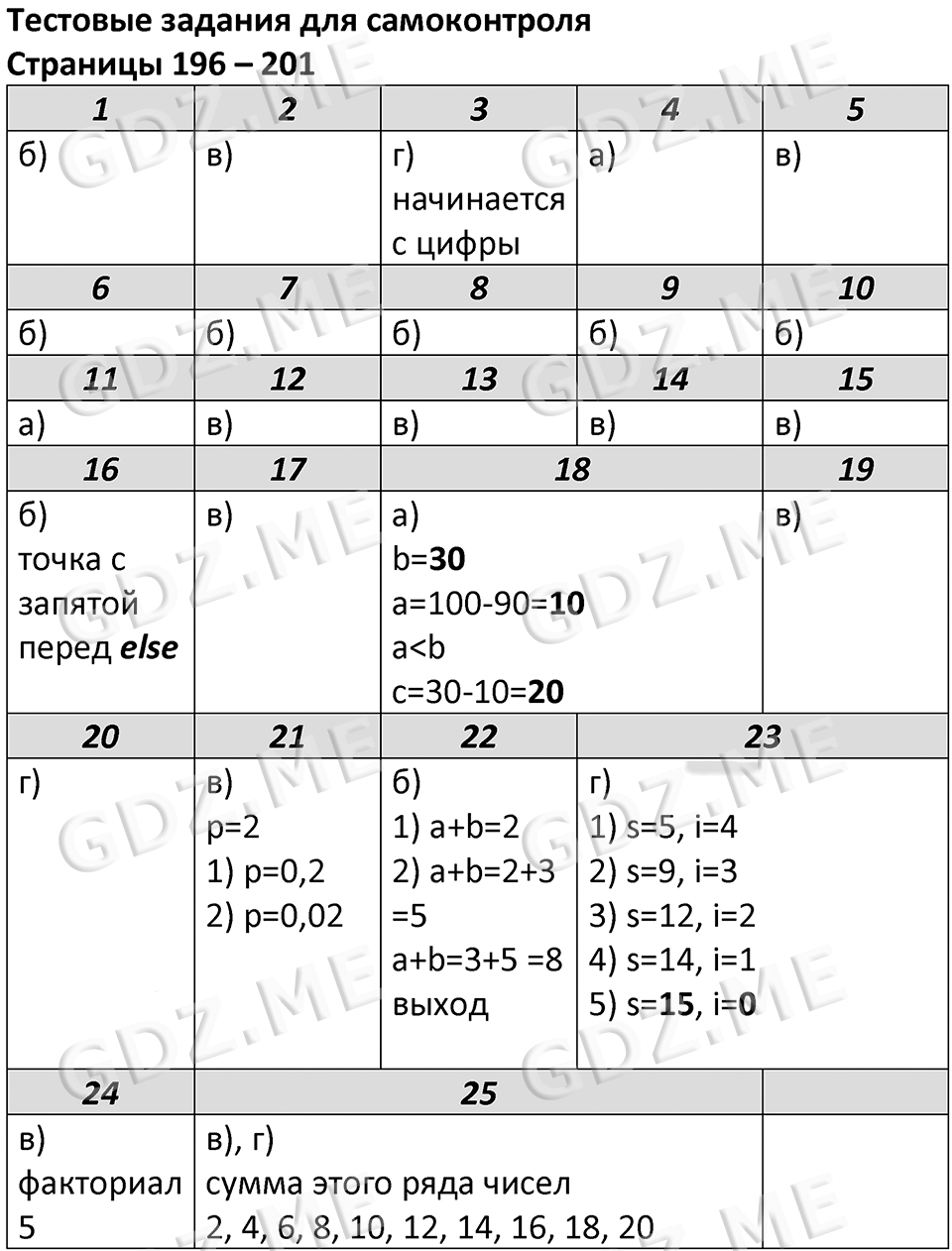Подробный вариант решения из решебника (ГДЗ): Номер номер 196-201.test (НОМЕРА РЕШЕНИЙ. §4.4. Программирование циклических алгоритмов. Страницы 191-195. Вопросы и задания) по предмету 8 класс, за , авторы учебника Босова.