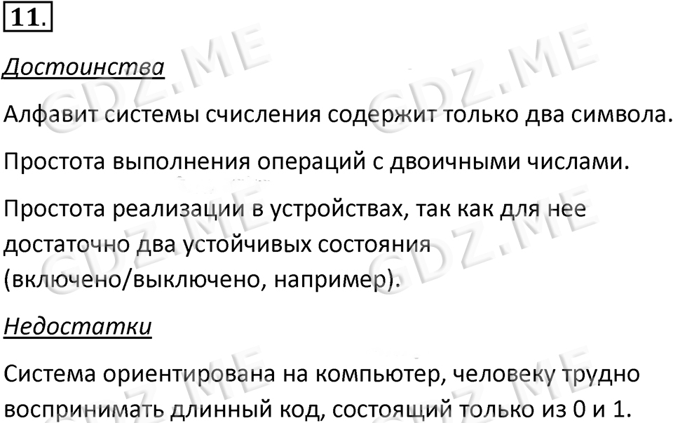 Подробный вариант решения из решебника (ГДЗ): Номер номер 11 (НОМЕРА РЕШЕНИЙ. §1.2. Двоичная система счисления. Страницы 21-22. Вопросы и задания) по предмету 8 класс, за , авторы учебника Босова.