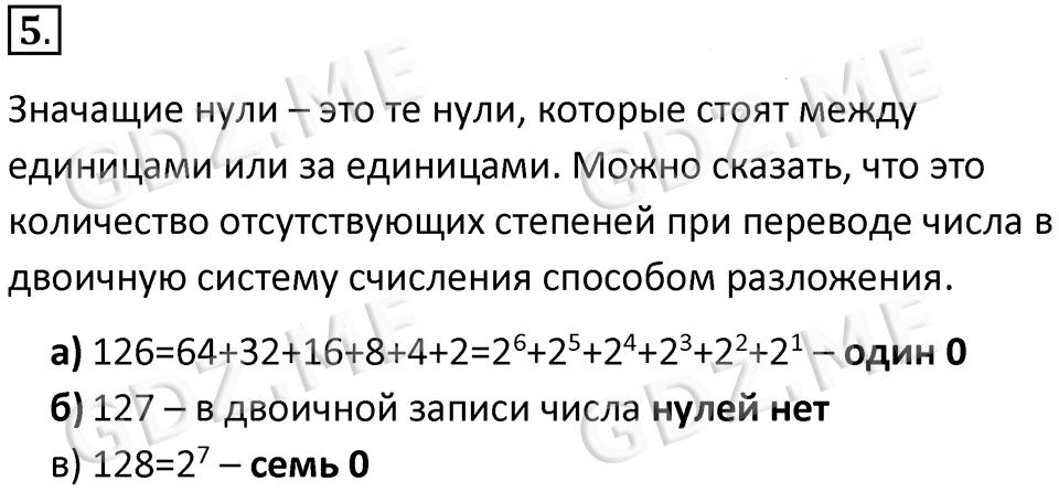 Подробный вариант решения из решебника (ГДЗ): Номер номер 5 (НОМЕРА РЕШЕНИЙ. §1.2. Двоичная система счисления. Страницы 21-22. Вопросы и задания) по предмету 8 класс, за , авторы учебника Босова.