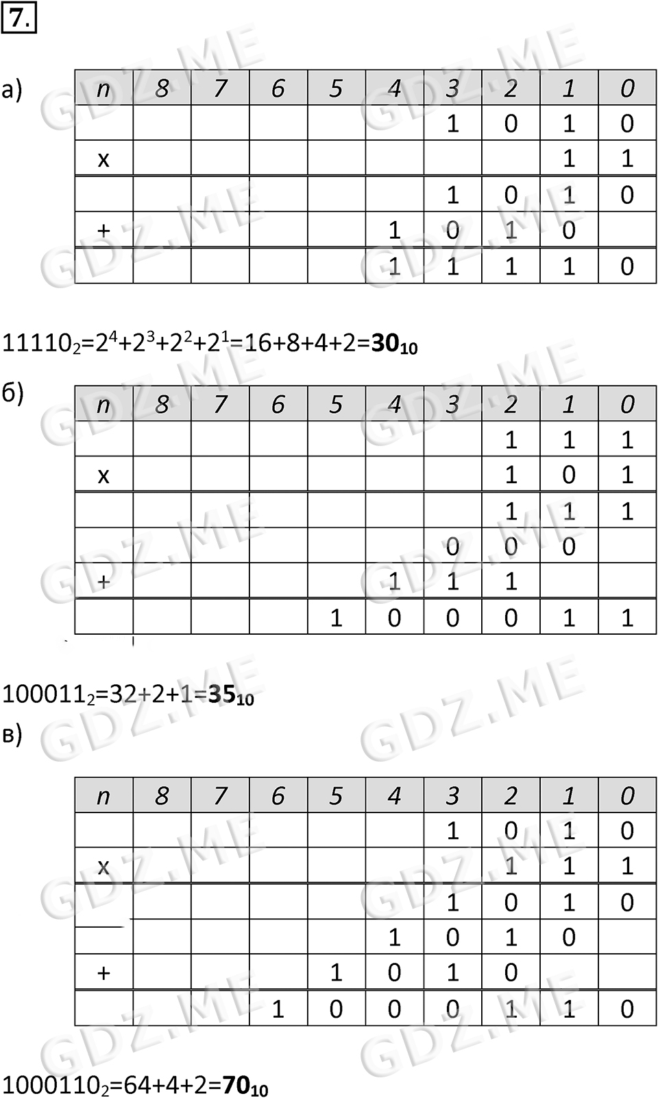 Подробный вариант решения из решебника (ГДЗ): Номер номер 7 (НОМЕРА РЕШЕНИЙ. §1.2. Двоичная система счисления. Страницы 21-22. Вопросы и задания) по предмету 8 класс, за , авторы учебника Босова.
