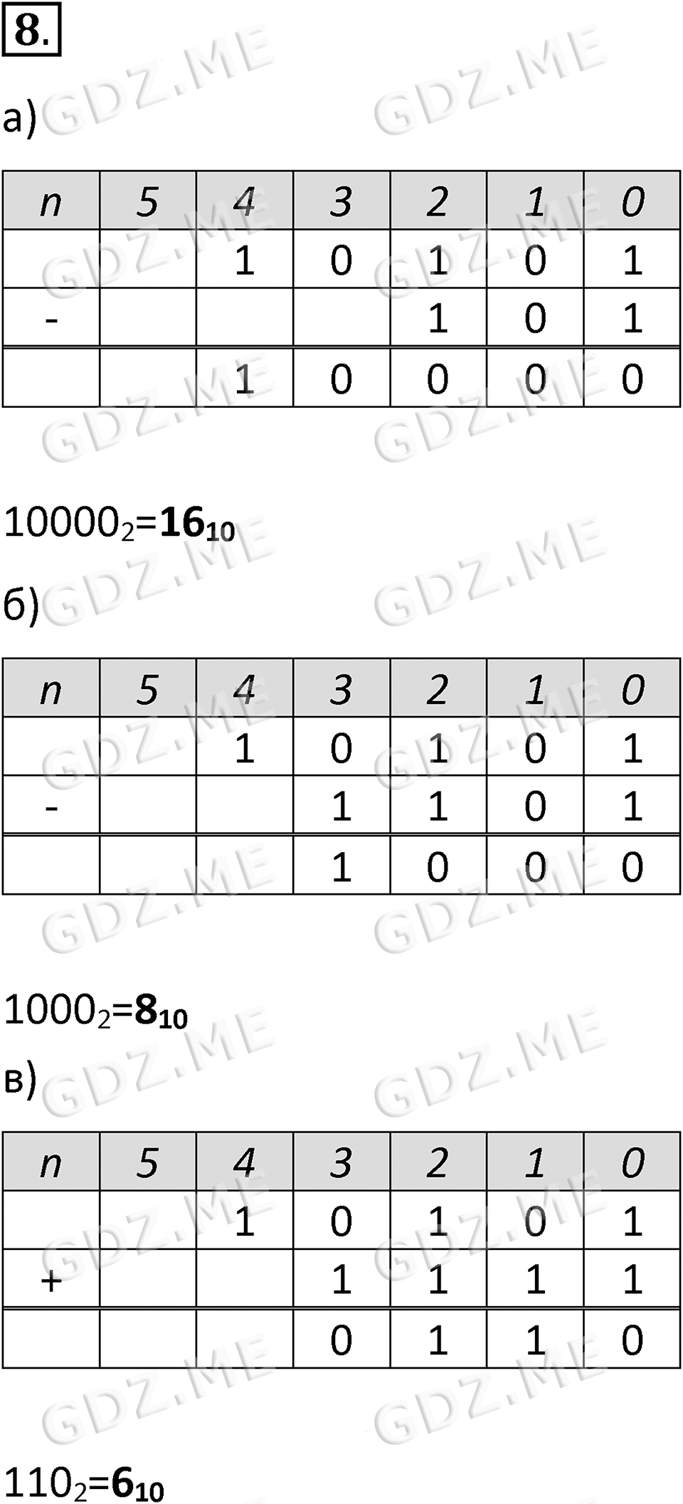 Подробный вариант решения из решебника (ГДЗ): Номер номер 8 (НОМЕРА РЕШЕНИЙ. §1.2. Двоичная система счисления. Страницы 21-22. Вопросы и задания) по предмету 8 класс, за , авторы учебника Босова.