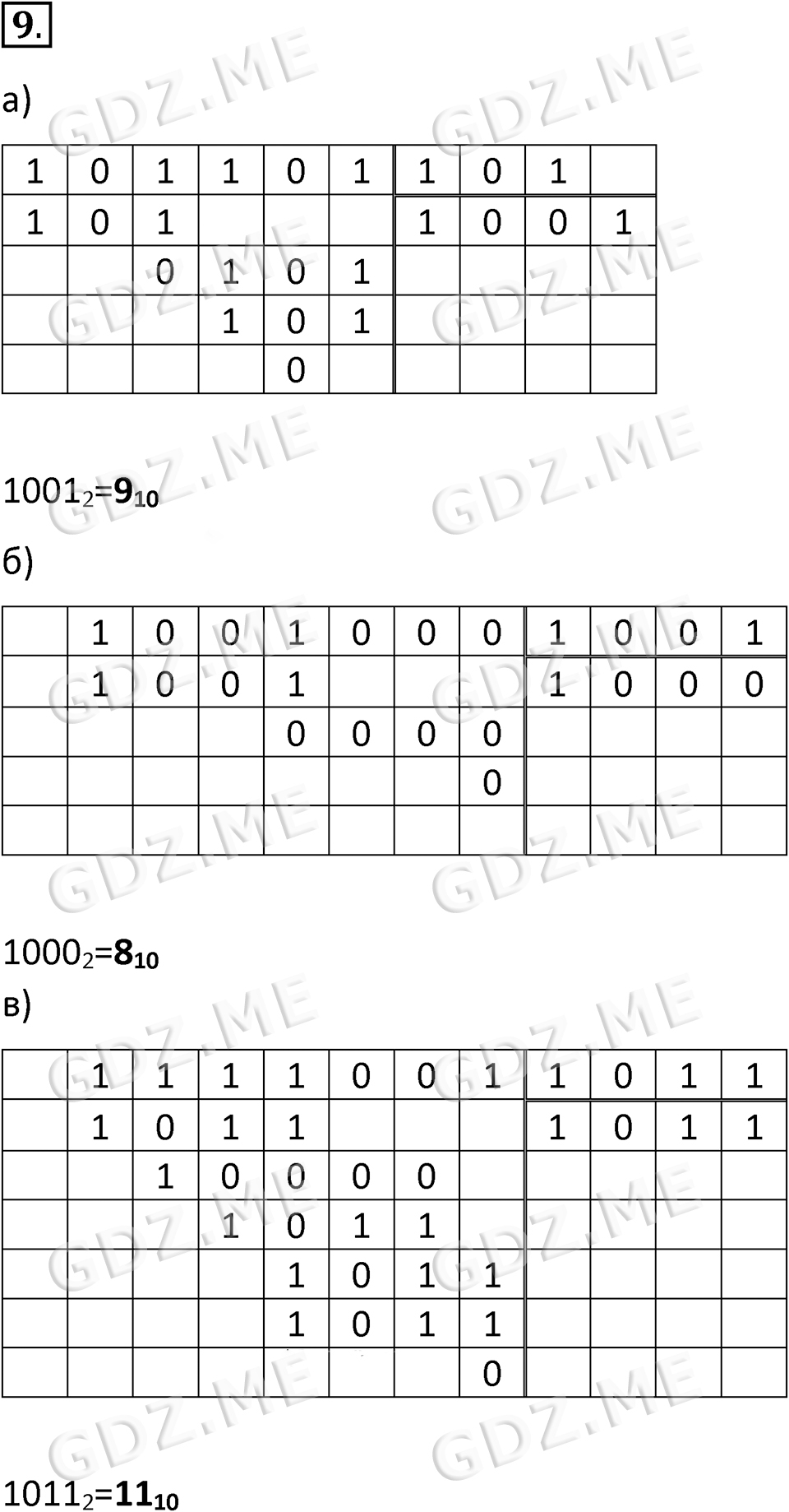 Подробный вариант решения из решебника (ГДЗ): Номер номер 9 (НОМЕРА РЕШЕНИЙ. §1.2. Двоичная система счисления. Страницы 21-22. Вопросы и задания) по предмету 8 класс, за , авторы учебника Босова.