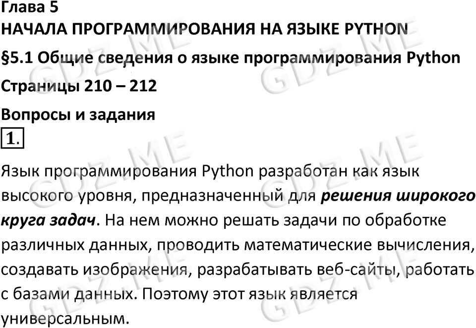 Подробный вариант решения из решебника (ГДЗ): Номер номер 1 (НОМЕРА РЕШЕНИЙ. §5.1. Общие сведения о языке программирования Python. Страницы 210-212. Вопросы и задания) по предмету 8 класс, за , авторы учебника Босова.