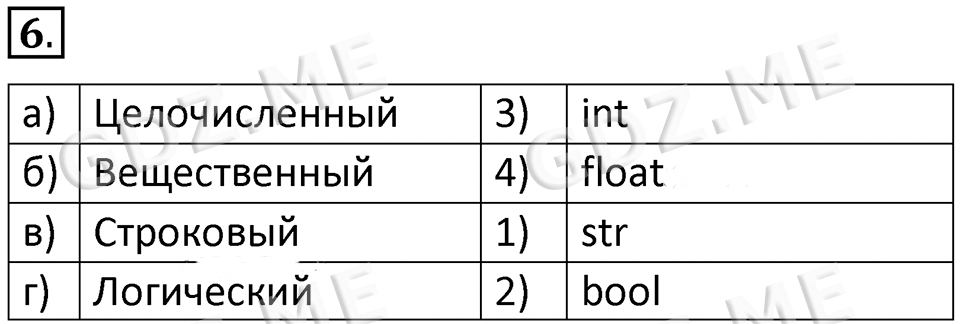 Подробный вариант решения из решебника (ГДЗ): Номер номер 6 (НОМЕРА РЕШЕНИЙ. §5.1. Общие сведения о языке программирования Python. Страницы 210-212. Вопросы и задания) по предмету 8 класс, за , авторы учебника Босова.