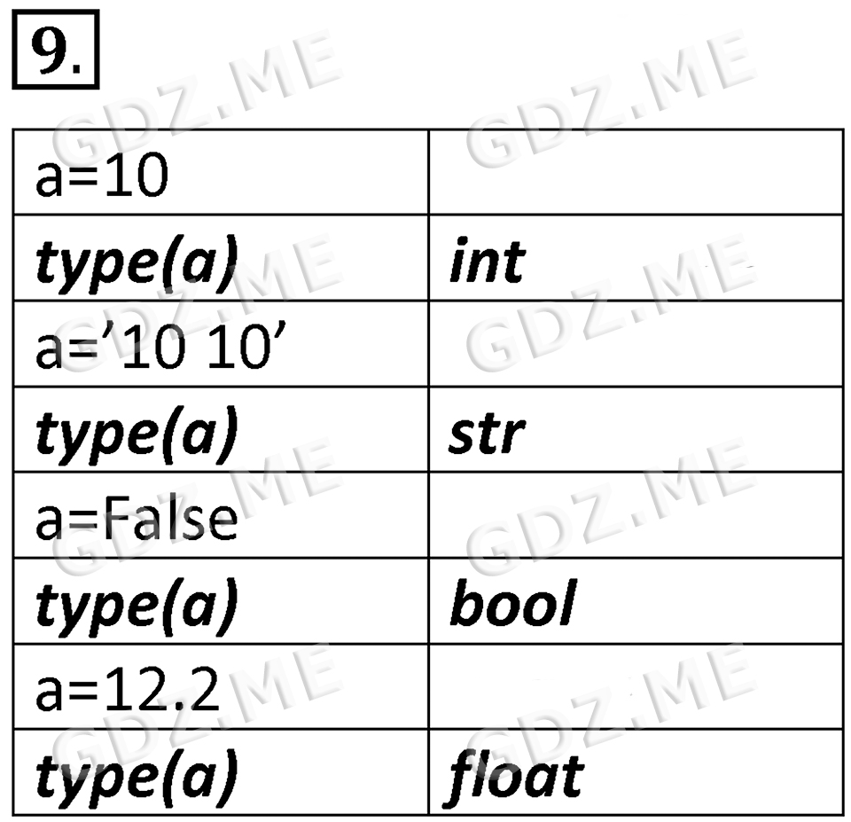 Подробный вариант решения из решебника (ГДЗ): Номер номер 9 (НОМЕРА РЕШЕНИЙ. §5.1. Общие сведения о языке программирования Python. Страницы 210-212. Вопросы и задания) по предмету 8 класс, за , авторы учебника Босова.