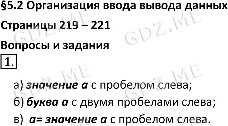 Подробный вариант решения из решебника (ГДЗ): Номер номер 1 (НОМЕРА РЕШЕНИЙ. §5.2. Организация ввода и вывода данных. Страницы 219-221. Вопросы и задания) по предмету 8 класс, за , авторы учебника Босова.