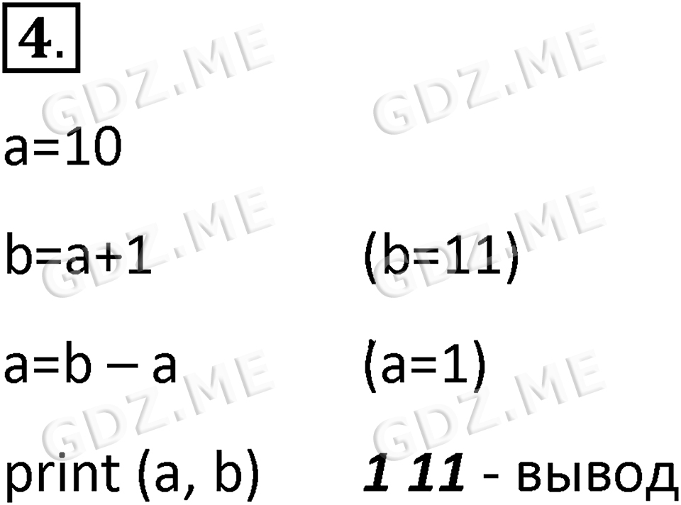 Подробный вариант решения из решебника (ГДЗ): Номер номер 4 (НОМЕРА РЕШЕНИЙ. §5.2. Организация ввода и вывода данных. Страницы 219-221. Вопросы и задания) по предмету 8 класс, за , авторы учебника Босова.