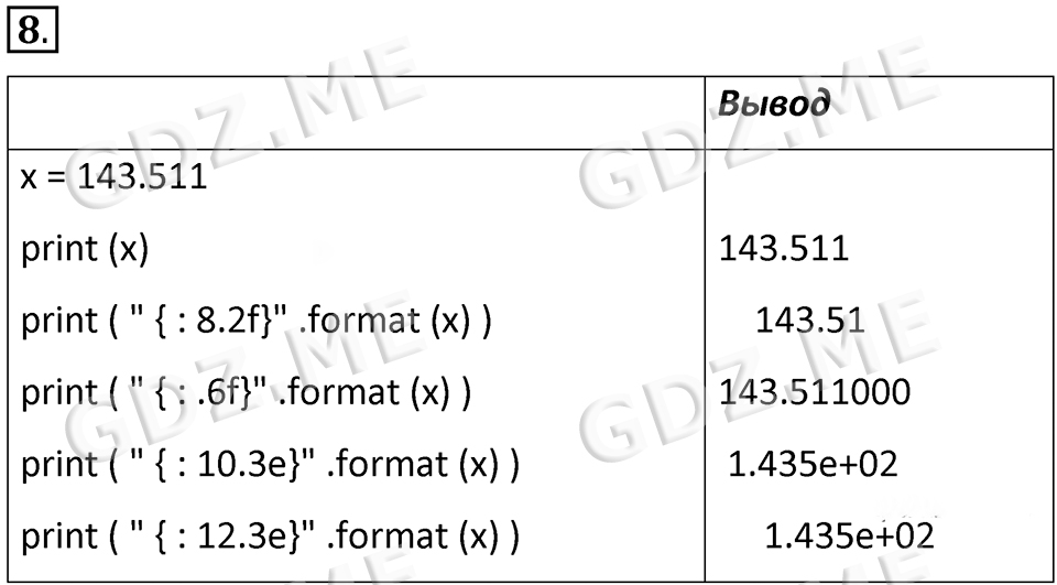 Подробный вариант решения из решебника (ГДЗ): Номер номер 8 (НОМЕРА РЕШЕНИЙ. §5.2. Организация ввода и вывода данных. Страницы 219-221. Вопросы и задания) по предмету 8 класс, за , авторы учебника Босова.