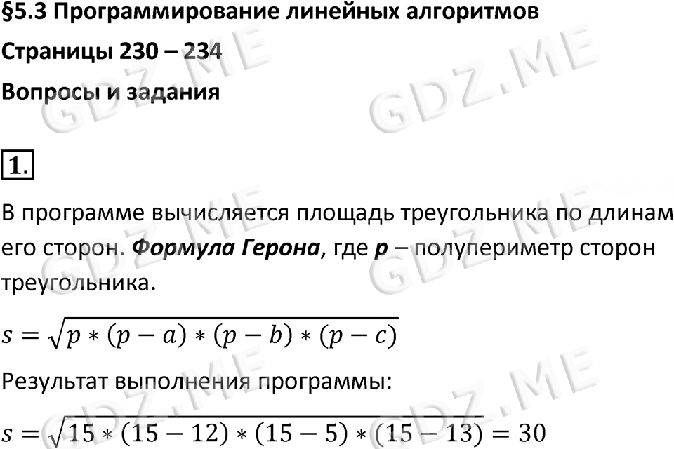 Подробный вариант решения из решебника (ГДЗ): Номер номер 1 (НОМЕРА РЕШЕНИЙ. §5.3. Программирование линейных алгоритмов. Страницы 230-234. Вопросы и задания) по предмету 8 класс, за , авторы учебника Босова.