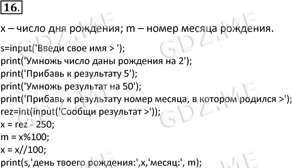 Подробный вариант решения из решебника (ГДЗ): Номер номер 16 (НОМЕРА РЕШЕНИЙ. §5.3. Программирование линейных алгоритмов. Страницы 230-234. Вопросы и задания) по предмету 8 класс, за , авторы учебника Босова.