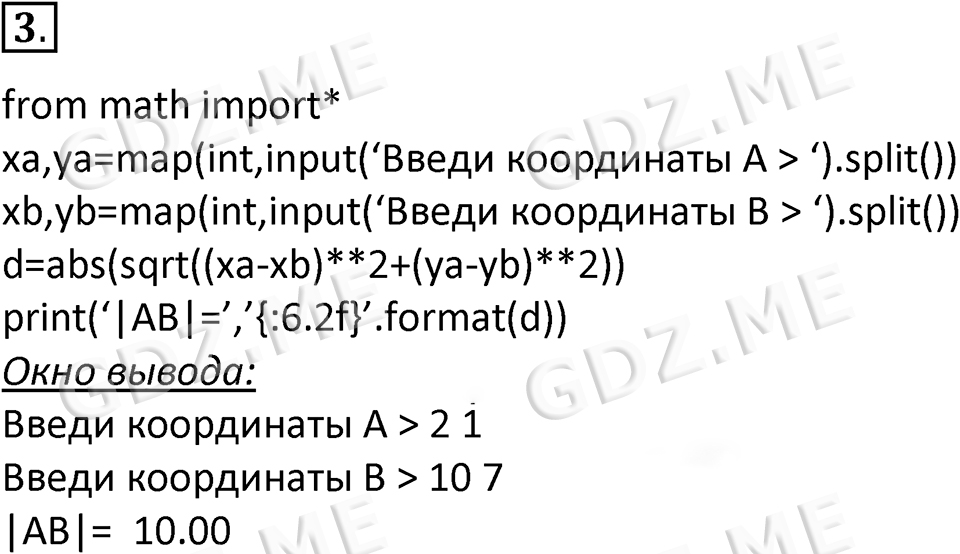 Подробный вариант решения из решебника (ГДЗ): Номер номер 3 (НОМЕРА РЕШЕНИЙ. §5.3. Программирование линейных алгоритмов. Страницы 230-234. Вопросы и задания) по предмету 8 класс, за , авторы учебника Босова.